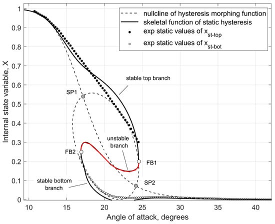 Figure 13 graphically presents major constructions in designing the nonlinear functions in Equation (7). The dashed lines represent the nullcline set of points defined by the equation . The function is crossing the ellipse defined by the morphing function in two saddle points, and . These two saddle points are structurally unstable, and the function applied in the vicinity of the saddle points transforms the nullcline set of points into a continuous folded curve, which shapes a skeletal function for static hysteresis. This curve includes two stable branches of static hysteresis, one on the top, with , and one on the bottom, with . The intermediate branch (red segment) represents an unstable solution to Equation (7), which separates regions of attraction of stable branches (two black segments). Two fold bifurcation points, and , on the skeletal curve indicate jump-like transition from one stable branch of static hysteresis to another stable branch depending on the direction of the angle-of-attack variation. The presented skeletal hysteresis function was adapted to the experimental positions of for the top and bottom branches of static hysteresis: and . More details about the constructed functions are given in Appendix A.