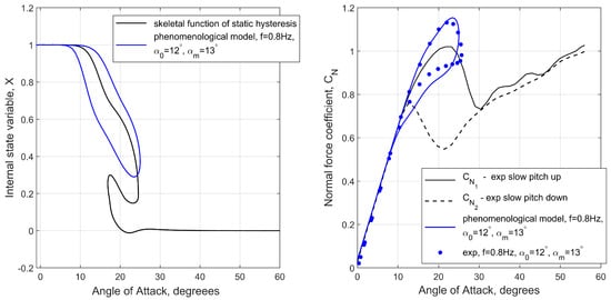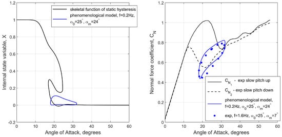 Figure 12 shows that the constructed nonlinear functions shown in Figure 13 accurately model the quasi-static hysteresis, showing good matching with the experimental data. Three different cases of dynamic hysteresis were modelled: (a) the loop around the static hysteresis zone (shown in Figure 14), (b) the loop on the top branch of reaching bifurcation point (shown in Figure 15) and (c) the loop on the bottom branch of reaching bifurcation point (shown in Figure 16). The images on the left in Figure 14, Figure 15 and Figure 16 show dynamic variations in the internal state variable () with respect to the skeletal function of static hysteresis. The phenomenological modelling results in all three cases (a–c) are very close to the experimental wind tunnel data for different amplitudes and frequencies of oscillation. The tuning of the nonlinear function in the model equation (Equation (7)) was carried out manually by a trial-and-error method for an ensemble of the considered processes. A formal mathematical approach for the parameter identification of phenomenological bifurcation models needs further research.
