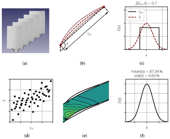 Steps of a Monte Carlo Simulation on an example analysis of compressor blades. (a) Data acquisition; (b) parameterization; (c) statistical description; (d) sampling; (e) deterministic calculations; and (f) statistical evaluation.