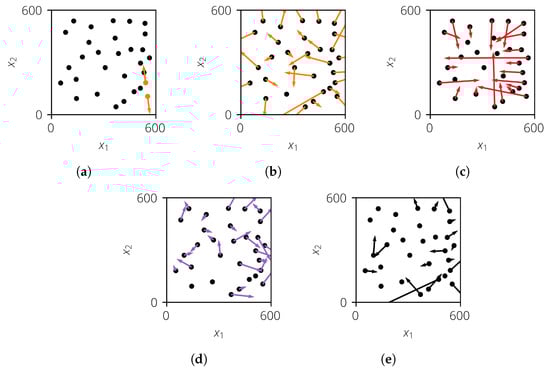Calculation of forces for one iteration step. (a) The inner force (orange) between two realizations; (b) the resulting inner force (orange) of all realizations; (c) the resulting outer force (red) of all realizations; (d) the resulting frictional force (violet) of all realizations; and (e) the resulting total force (black) of all realizations.