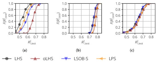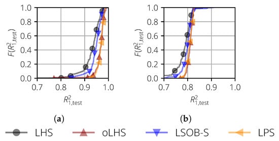 Two test cases are analyzed. In the first test case, no noise is considered and the parameter is set to . Figure 5a shows the distribution of . If the distribution lies more to the right, then this means that the corresponding sampling method yields better surrogate models in a statistical sense. In this particular case, the curves for oLHS and LPS match and are more to the right compared to the curves of LHS and LSOB-S, such that the former two sampling methods are superior.