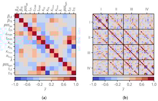 Correlation matrix of the profile parameters for the turbomachinery test case. (a) . (b) .