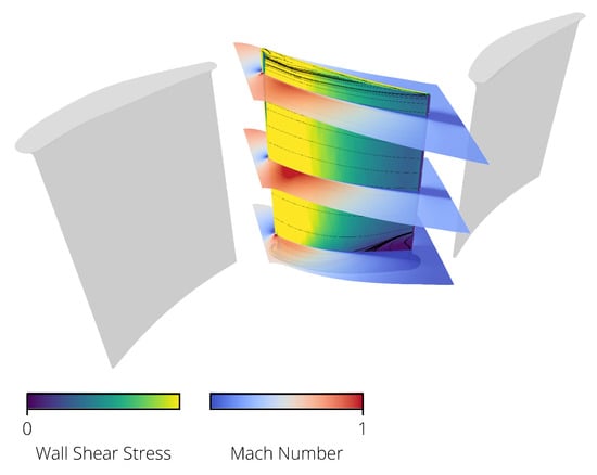 with and as the changes in the specific enthalpy of the isentropic and real process, respectively. The 3D CFD calculations were performed with the Rolls-Royce proprietary HYDRA CFD system using a stator–rotor–stator configuration. The geometry of the vanes is kept constant to focus only on the effect of the blades. The flow domain is discretized using the tool PADRAM, thus resulting in an O-H-grid mesh of approximately nodes. The flow field is calculated with stationary Reynolds-averaged Navier-Stokes equations with the Spalart-Allmaras turbulence model. Boundary conditions are specified as radial profiles of the total temperature, total pressure, radial and tangential flow angles, and the Spalart variable at the inlet. A flow capacity is specified at the outlet of the domain. The analyzed operating point is at the design point speed line near peak efficiency. The flow field around the blade is visualized in Figure 10. There, the wall shear stress (an indicator for the boundary layer state) and the Mach number are shown.