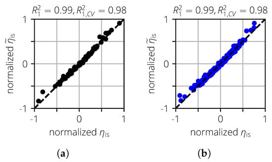Actual vs. predicted plots for the turbomachinery test case. (a) . (b) .