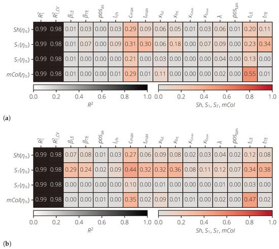 The results of the sensitivity analysis are shown in Figure 12. For a better comparability of the results, the parameters were grouped for . A group consists of the same profile parameters in the different averaging domains. Based on the mCoI, , , and can be identified as the most important input variables for the isentropic efficiency . All other input variables have a significantly smaller mCoI value, which are close to 0.