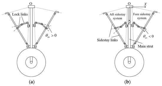 The retraction process of the landing gear is as follows: When the landing gear is retracted, under the action of the unlocking actuator, the upper and lower lock links on both sides fold up to a certain angle to complete the unlocking action. Then, under the load of the retraction actuator, the main strut rotates upward around the rotation joint axis (axis 1) at the root to retract until the lock column hangs at the upper hook ring lock to complete the uplocking, and the fore and aft sidestay systems follow the movement to the retracted position. When the landing gear is extended, the main strut is gradually lowered around the axis due to the combined effects of gravity and the retraction actuator. When it is close to the locking position, the lock link quickly jumps from the upper over-center state ( > 0° in Figure 2a) to the lower over-center state ( < 0° in Figure 2b) under the action of the locking spring and stabilizes at the position of the limit block, finally completing the landing gear’s downlocking.
