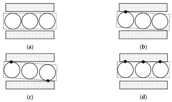 Cylindrical pair model with clearance: (a) complete separation mode, (b) one-point contact mode, (c) two-point contact mode, and (d) line contact mode.