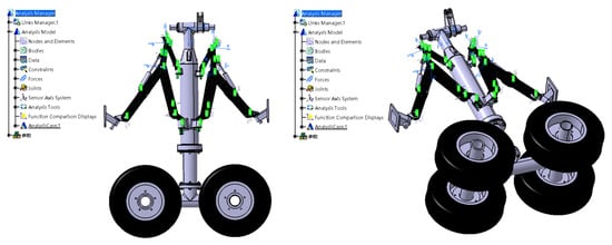 - The flexible and rigid components are assembled into a complete model in LMS Virtual.Lab, and the rigid–flexible-coupling dynamic simulation model of the DSS landing gear is obtained, as shown in Figure 6.
