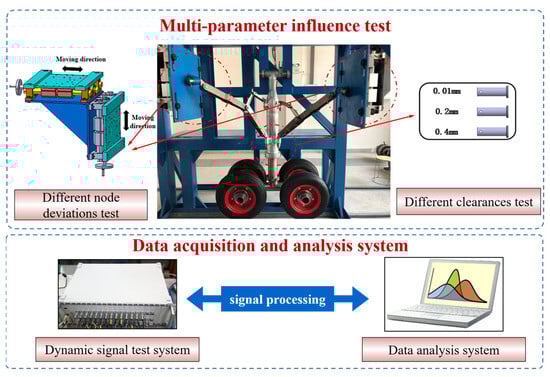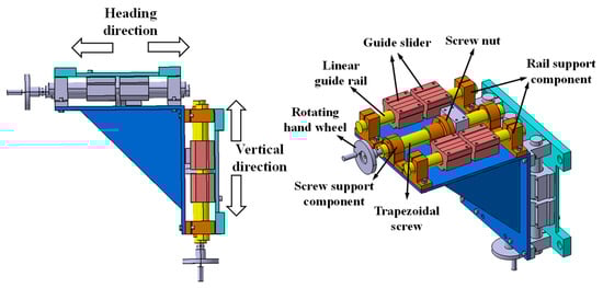During the flight of an aircraft, deformation of the wing or the assembly deviation of the nodes may cause the installation node position of the upper sidestay nodes to deviate from the initial position. To simulate the impact of the node deviation of the DSS landing gear under real conditions on the synchronous locking performance of the landing gear, this experiment designed a node deviation simulation device, as shown in Figure 8. This device is composed of components such as trapezoidal screws, screw nuts, and linear guide-rail guide sliders. Due to the good self-locking property of the trapezoidal screws, they can conveniently adjust and lock the deviation of the installation node in the flight direction (X direction) and the vertical direction (Z direction).