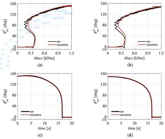 Comparison of simulation and test results: (a) curve; (b) curve; (c) curve; and (d) curve.