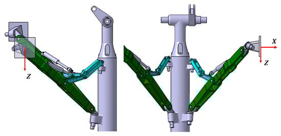 Due to wing deformation or errors during installation and machining, the nodes of the DSS landing gear may have a certain deviation relative to the design position. It is necessary to study the influence of hinged point deviation on synchronous locking for the over-constrained DSS mechanism. The deviation models in the X direction (heading) and Z direction (vertical) are established at the characteristic points of the axis of the hinge point. The deviation direction of the hinge point is shown in Figure 12. In the simulation and test, the deviation distance generated by moving along the X direction and Z direction, respectively, is used to stagger the position of the original four-line common point.