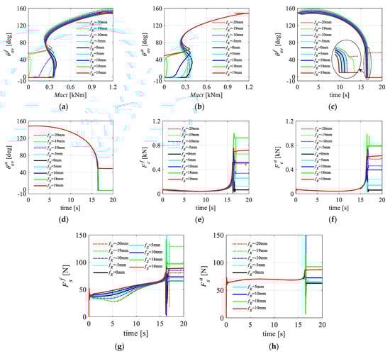 The simulation analysis indicates that the synchronous locking performance of the landing gear has different sensitivities to node deviations in different directions. The sensitivity to the Z direction of the aft sidestay node deviation is the largest, and the sensitivity to the X direction of the fore sidestay node deviation is the smallest. However, the influence rules of node deviation in different directions on the motion trajectory and load transfer characteristics of the landing gear are very similar. Therefore, the following takes only the installation deviation of the fore sidestay node in the X direction (using to represent it) as an example to investigate the influence of node deviation on the synchronous locking performance of the landing gear and sets the node deviation conditions from −20 mm to 19 mm. The simulation results are shown in Figure 13. The definition of related variables is the same as above; in addition, represents the load of the fore sidestay node, represents the load of the aft sidestay node, represents the load of the fore lock node, and represents the load of the aft lock node.