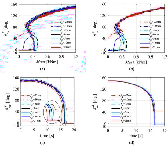 As shown in Figure 13a,b, when there is no deviation of the nodes, the lock links on both sides are locked almost synchronously. With a gradual increase in the deviation of the fore sidestay node in the positive X direction, the locking behavior of the aft lock link gradually lags until it cannot be completed (fX = 19 mm); as the deviation in the negative X direction gradually increases, the locking behavior of the fore lock link gradually lags until it cannot be fully locked (fX = −20 mm). Notably, near the locking position, there is a jump mutation process in the lock link. When the positive deviation is larger, the angle of the fore lock link at the time of the jump will decrease, and the jump angle of the aft lock link will increase.