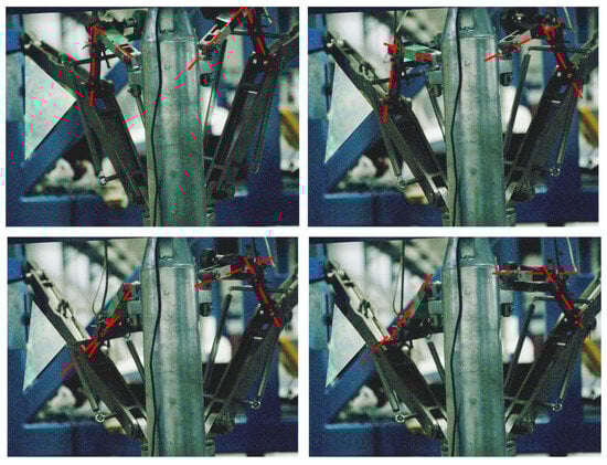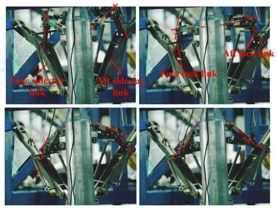 As shown in Figure 14c,d, the deviation of the fore sidestay node in the X direction affects mainly the fore lock link and has a smaller impact on the aft lock link. When the node deviation value is small, the lock links on both sides are locked almost synchronously (as shown in Figure 15). With the increase in the deviation, the locking time of the lock links on two sides is obviously asynchronous (as shown in Figure 16, the aft lock link gradually lags). As the deviation value continues to increase, when fX = −22 mm, the fore lock link cannot be fully locked, and when fX = 21 mm, the aft lock link cannot be fully locked (as shown in Figure 17). Compared with the simulation analysis results, the overall range is expanded by approximately 1 mm, which shows that the actual DSS landing gear prototype has a higher tolerance for node deviation than the simulation model does and that the conditions required for synchronous locking are easier to achieve. The change law of the test results is similar to that of the simulation results, thus effectively verifying the accuracy of the simulation model for the impact of node deviation.