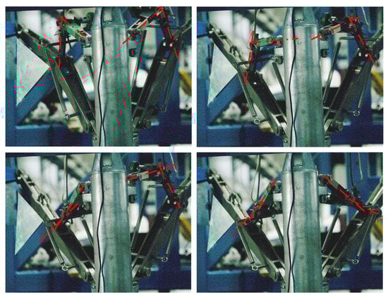 According to the retraction principle and design requirements of the DSS landing gear, a scaled-down prototype model for the synchronous locking test was built by CATIA V5R21. Each component of the prototype was processed according to the design drawings. Considering the sensitivity of the DSS landing gear to structural parameters, a reasonable assembly tolerance and processing technology were designed to meet the stringent design requirements of the “four axes intersecting at one point” of the 3D retraction mechanism. After production and processing, the prototype parts that meet the test requirements were obtained. The assembly of the components resulted in the DSS landing gear test platform shown in Figure 7.