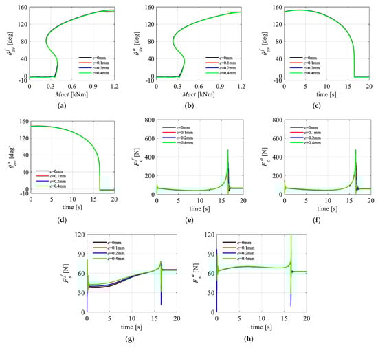 Joint clearance simulation curves: (a) curve; (b) curve; (c) curve; (d) curve; (e) curve; (f) curve; (g) curve; (h) curve.