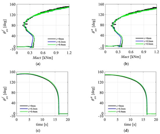 A comparison of the test results and the dynamic simulation data is shown in Figure 11. Among the results, represents the fore lock link over-center angles, represents the aft lock link over-center angles, and Mact represents the retraction torque. The simulation curves of the fore and aft lock links over-center angles with respect to the extension time basically coincide with the experimental curves. The curves of the fore and aft lock link over-center angles with respect to the retraction torque exhibit a small difference near the jump lock because, after the lock link crosses the critical position, the locking action is quickly completed. Under the effect of damping, the retraction torque is greater than that in the simulation data.