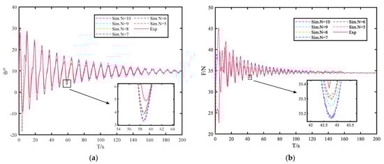 The experimental and simulation results are shown in Figure 7. With the growth of the cable, the change period of the pitch angle and the cable tension also become longer, and the amplitude decay becomes faster. The main reason for this is that the pitch angle of the balloon is obtained by the superposition of the rotation angle of the balloon relative to the main node and the rotation angle of the cable relative to the tethering point; a longer cable will make the rotation period of the cable around the tethering point longer, thus increasing the change period of the pitch angle; and the change period of the tension at the bottom of the cable is positively correlated with the change period of the balloon’s pitch angle. The period of change in the tension at the bottom of the cable is positively related to the period of change in the pitch angle of the balloon. As the initial inclination angle of the cable decreases, the pitch angle of the balloon and the period of the tension at the bottom of the cable remain unchanged, and the amplitude decreases because the initial inclination angle of the cable decreases, which results in a smaller amplitude of the cable oscillation. In the experiments and simulations, the change period of the pitch angle of the balloon and the tension at the bottom of the cable are close to each other, and the amplitude of the change in the simulation slightly increases compared with the experimental value, because the environment of the simulation is more ideal, and the balloon is not completely moving in the longitudinal plane in the experimental process, which results in the aerodynamic force of the balloon slightly increasing compared with that in the simulation, which leads to the small amplitude of the pitch angle of the balloon. The simulation results of the main tether model with different numbers of mass points are very close to the experimental results in terms of both the pitch angle of the balloon and the cable tension. In this paper, for the reduced-scale tethered balloon system with a main cable with a relatively short length, the number of cable mass points is five and meets the requirement for computational accuracy.