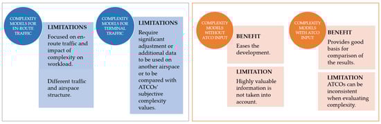 Identified benefits and limitations of developed air traffic complexity models based on type of traffic and control, and ATCOs’ input.