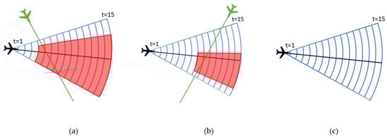 The fourth categorisation is based on the available manoeuvring area for aircraft in conflict. It is an area calculated as a possible aircraft turn for 20° to the left and to the right from the current position for the next 15 min (with a 5-nautical-mile distance from other traffic, minimum radar vectoring altitude, and boundary—except for entry flights and active zone if any). The area is the same for each aircraft without any obstacles on the way and is noted as Amax. There are three categories (a) 0–30% Amax, (b) 30–65% Amax, and (c) 65–100% Amax. The most complex should be option a) where there is the least manoeuvring area for the aircraft. An example of the calculated area for three cases is presented in Figure 3. In the figure, observed aircraft and its route are marked black. Blue lines represent the aircraft position in t time for 20° to the left and to the right from the route. Green aircraft is the conflicting traffic to the black one. Red colour represents an area in which green aircraft must not enter as the separation minima is then lost. Once the aircraft distance from the obstacle or conflicting traffic is 5 nautical miles or less, it will deviate and change the heading. Amax is calculated as an area free from obstacles that does not contain the area coloured in red.