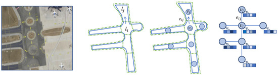 - Airport network. In this study, the airport network is defined as a directed graph , where is the set of all taxiing segments and is the edge set. For the sake of convenience, the “taxiing segment” is also referred to as the “link” hereafter. Edge denotes the edge connecting link and link , if there is a connection from link to link . See Figure 1 for an overview.