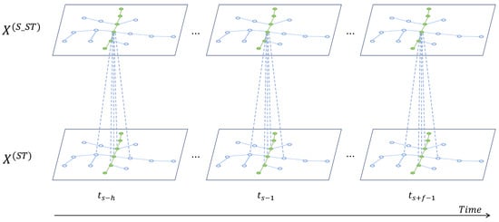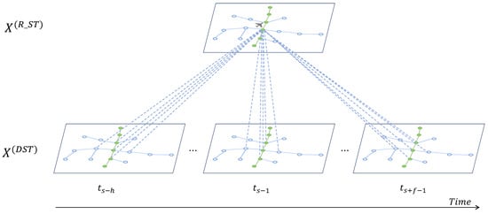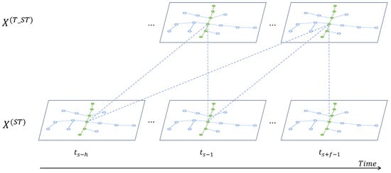 Intuitively, the taxi time for an aircraft within a given taxiing segment is related to the historical and future traffic states of the taxiing segment itself and its neighbors, as well as the flight properties. For instance, aircraft of different types may require different amounts of time on the same taxiing segment, even under the same traffic conditions. Therefore, in the second stage, we design a 3D cross spatio-temporal attention network [31,36] to adaptively model the joint dynamic spatio-temporal correlations between the hidden states of flight properties and hidden states of the taxiing segments (generated in the first stage) through which the taxi route passes, as well as those of their neighbors. Then, we obtain the higher-level spatio-temporal representation of the taxi route, as illustrated in Figure 6.