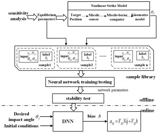 The analysis of the analytical solution formulas shows that there Is a strong nonlinear mapping relationship between the bias term and the terminal impact angle of the flight vehicle, and deep neural networks (DNNs) have been shown to be able to accurately respond to this type of mapping relationship with low computational effort [19,20,21,22]. Hypersonic vehicle re-entry multi-constraint guidance based on a predictive correction guidance framework, where the prediction module of the predictive correction is implemented by a DNN, is implemented in [19]. A functional relationship between the expression of the optimal guidance law and the relative state of the flight vehicle was established in [20] and achieved by training a DNN. Although the exact guidance equation cannot be obtained, it is possible to obtain the guidance law by training another DNN with a set of termination conditions. An online neural network guidance law that considers the randomness of perturbations during flight vehicle flight was designed in [21], allowing for online compensation once the perturbation appears. A model-based deep learning method was proposed in [22], where the structure of the guidance law was first obtained based on the model’s predictive control, and then a DNN was used to approximate the predictive model of the guidance dynamics and incorporate it into the model predictive path–integral control framework, enabling the designed guidance law to adapt to complex environments. Although DNNs are better suited to solving mapping relations in guidance control, the amount of training samples required is generally larger. The cost of obtaining data is also extremely high, and the minimum amount of data possible needs to be applied for training.
