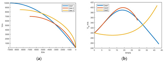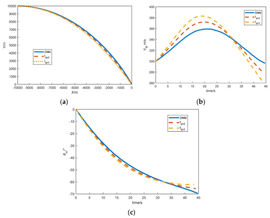 In this section, the accuracy of the trained model is validated. Three different initial conditions are selected for simulation. For ease of analysis, we set the initial velocity to and the target coordinates to . The remaining simulation parameters are shown in Table 3. The simulation results are shown in Figure 7.