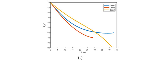 Finally, when analyzing for ease of analysis, we select as the analysis value. We designate the three levels as , , and , with parameter values of for the lower limit, for the middle value, and for the upper limit. Simulations will be conducted for these three cases, and the results are shown in Figure 2c. The results show that regardless of the level considered, the variation in had a relatively significant impact on , exhibiting an overall increasing trend. Therefore, a smaller sample interval should be chosen, especially when is larger. Additionally, from the lower limit curve, because, at larger desired impact angles, the acceleration capacity is limited, there is a slower response to the impact angle term and a steep increase in . Hence, this experiment demonstrates the strong correlation between the desired impact angle term and acceleration capacity. Analyzing the limited acceleration and incorporating it as an input is crucial for accurate guidance.