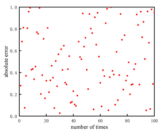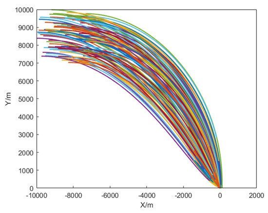 Monte Carlo simulation experiments were conducted to validate the DNN’s accuracy further. For illustration purposes, we randomly selected 100 sets of initial positions within the range of to and desired descent angles ranging from −60° to −90° while keeping the other parameters constant. The remaining parameters were set as follows: an initial velocity of 300m/s, target coordinates at , an initial pitch angle of , a navigation gain of , and maximum acceleration of 2 g. The flight vehicle’s trajectory for the randomly selected 100 sets of initial positions is shown in Figure 8, which shows that all 100 Monte Carlo simulation experiments resulted in hitting the target. The difference between the actual impact angle and the desired impact angle is shown in Figure 9.