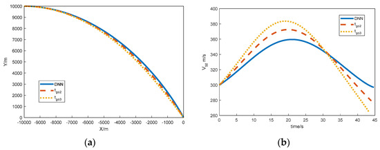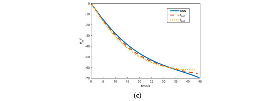 Figure 12 and Table 9 show that although all three cases hit the target, and the final impact angles obtained by the DNN model designed in this study were closer to the desired impact angles than those by the traditional methods, the difference is only . This result demonstrates that the DNN model in this paper provides higher precision in estimating the bias term. Compared to the case without noise, although the actual impact angles are greater, the difference is only , demonstrating the robustness of the DNN model designed in this study.