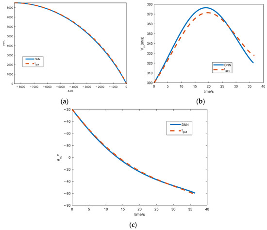 Accuracy on the test set. (a) Flight trajectory; (b) velocity curve; (c) flight path angle.