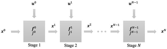At its core, the IMF divides a complete trajectory into a series of stages but “connects” each stage through a sequence of equality constraints (see Figure 1). Each stage receives inputs of the states and controls from the previous stage but independently optimizes control over only its respective stage [54]. Please note that the IMF is used for deriving the required rigorous optimality relations associated with minimum-time trajectory optimization problems. These relations are later used within a backward-forward framework to determine reachable sets. The entire trajectory can be discretized into N stages, and the i-th stage (for ) can be modeled with its dynamical system consisting of states, ; controls, ; and parameters, , where the superscript denotes the stage index as,