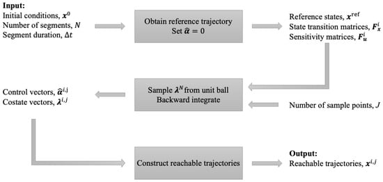 To generate a reference trajectory, we consider a zero-thrust (i.e., ballistic) trajectory. This is due to a trivial solution of the OCP in which , causing . The system dynamics are forward-in-time integrated from the initial conditions, , with no control to obtain the reference trajectory, , and matrices and . Next, we sample terminal stage costates, , from a six-dimensional unit ball (i.e., ). The reason we uniformly sample is due to the control law in Equation (16), which indicates that the magnitude of does not matter (the control law is homogeneous in costates); hence, a reasonable method to determine these values is to uniformly sample them from a unit ball. The proper sampling algorithm is provided in Appendix A. All previous stage costates are recovered backward in time through a recursive matrix multiplication, as outlined in Equation (10). The optimal control can be computed using Equation (16), and a final forward-in-time integration is used to produce the entire reachable set. The indices i and j in Figure 3 indicate the i-th stage variable quantity and the j-th trajectory forming the reachable set. The reachable set approximation algorithm is outlined in Algorithm 1.