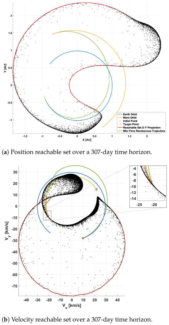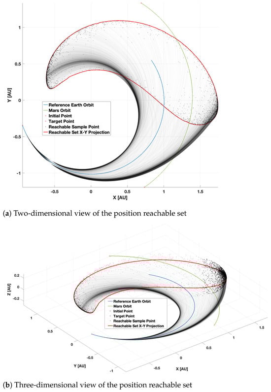 The results obtained for the rapid reachability and rendezvous determination problem for a minimum-time Earth-to-Mars transfer are presented in this section. This example was taken from [65]. For all results, Newton, s, and kg. The initial position and velocity vectors are km and km/s, respectively. The complete state vector of the spacecraft at the beginning of the maneuver is given as , with units km and km/s corresponding to a departure epoch of 10 April 2007. The segment duration, , is set to 86,400 s. The reachable set algorithm was implemented in MATLAB R2023a on a 2018 MacBook Pro with a quad-core 2.3 GHz processor, using parallel computing capabilities with 4 CPU cores. Additionally, MATLAB’s integrated code compiler was used to generate MEX files to speed up the algorithm. NASA’s spice toolkit was used to access DE440 planetary ephemerides. The computations were completed in the J2000 ecliptic reference frame, centered at the solar system barycenter.