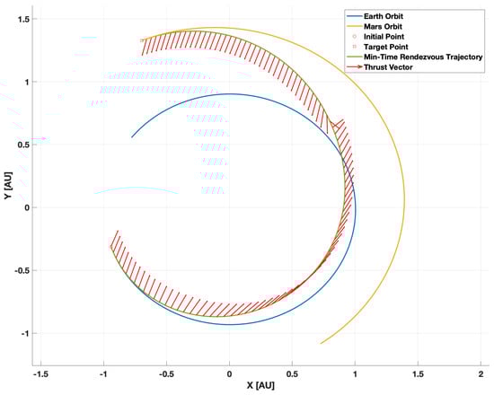 We seek to validate the accuracy of the reachable set estimate by comparing the results in Section 4.1 with a minimum-time trajectory optimization problem, as minimum-time trajectories lie on the boundary of the reachable set. We solve a minimum-time direct OCP with the same initial conditions listed above. The minimum-time Earth-to-Mars OCP was solved using CasADi v3.5.5 [66]); the resulting optimal trajectory and thrust vector are shown in Figure 5. It can be observed that the propulsion system operates at maximum thrust for the duration of the flight, with only the thrust direction (red arrows) in Figure 5 varying. The minimum-time Earth-to-Mars problem, when solved, resulted in a trajectory with a time of flight of 307 days. The trajectory also leveraged the Oberth effect (i.e., it utilized the gravitational well of the Sun to maximize the rate of change of its energy). Taheri posed a minimum-fuel Earth-to-Mars problem in [65] and described how a (Hamiltonian) two-point boundary-value problem arises from an indirect formulation, which can be solved with a single-shooting method (e.g., using MATLAB’s built-in fsolve function). We used this same formulation and manually iterated on the time of flight until a trajectory was determined that produced a constant maximum thrust profile in the shortest time of flight. The same solution can also be obtained by formulating a minimum-time OCP and using an NLP solver (e.g., CasADi v3.5.5 [66]).