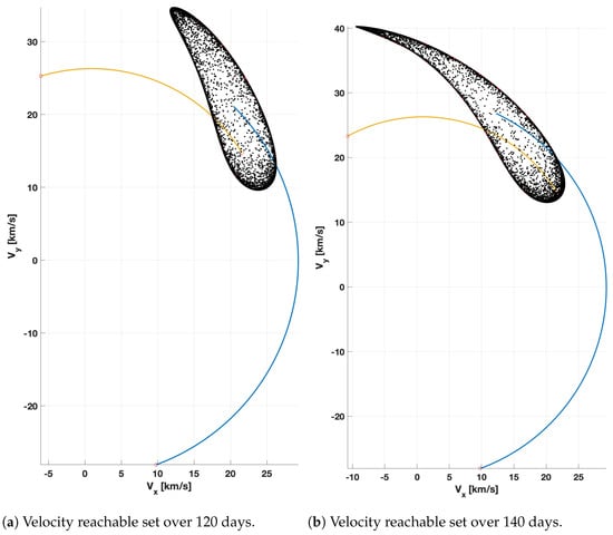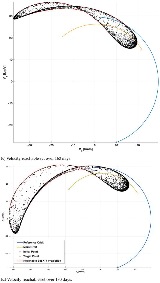 The solution of the minimum-time Earth-to-Mars problem aligns with ephemeris-consistent rendezvous boundary conditions (i.e., when the position and velocity of Mars depend on the time of flight). The resulting minimum-time trajectory can be used to demonstrate the validity of the reachable set estimations because a minimum-time trajectory, by definition, must terminate on the reachable set. To show this, we computed the reachable position and velocity sets for the time of flight computed by the optimal single-trajectory indirect OCP [57]. Figure 6 shows the evolution of the velocity reachable set through flight times from 120 to 180 days. We selected these times of flight since they correspond to the thruster direction reversing in Figure 5. The reachable set appears to fold upon itself when chronologically stepping from 140 days (Figure 6b) to 160 days (Figure 6c).