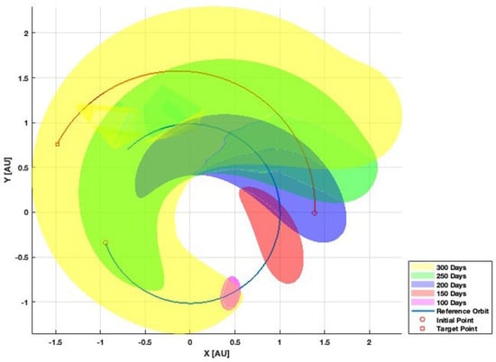 Figure 8 indicates the expansion of the reachable position set over an increasing time horizon, with flight times ranging from 100 to 300 days. This pseudo-qualitative plot was generated by interpolating all sampled trajectories on the reachable set to graphically illustrate the reachable set. The trajectory of Mars (red line) shows how the target position evolves with increasing time of flight.