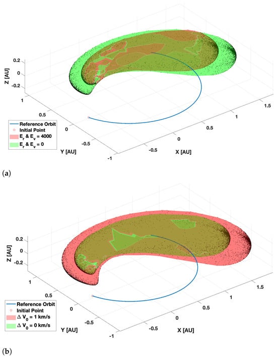 Comparison of position reachable sets over a 200-day time horizon with 5000 samples with different initial types of uncertainties. (a) With uncertainties on the initial position and velocity vectors as defined in Equation (19). (b) With an initial impulse maneuver as defined in Equations (25) and (26).
