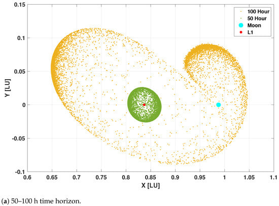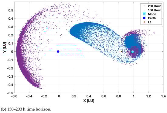 A low-thrust spacecraft with N, s, and 1500 kg of initial mass is considered. The initial state vector is given in nondimensionalized coordinates as . The reachable set was computed for time-horizon values ranging from 50 to 200 h. Each trial used 100,000 sample trajectories. The longest simulation run time, for 200 h, took 119 s. Compared with [67], which is a planar implementation of cislunar CR3BP, Figure 10 utilizes full three-dimensional dynamics. The computational advantage of our proposed method is significant and is expected since the determination of the reachable set using a direct optimization method is computationally demanding.