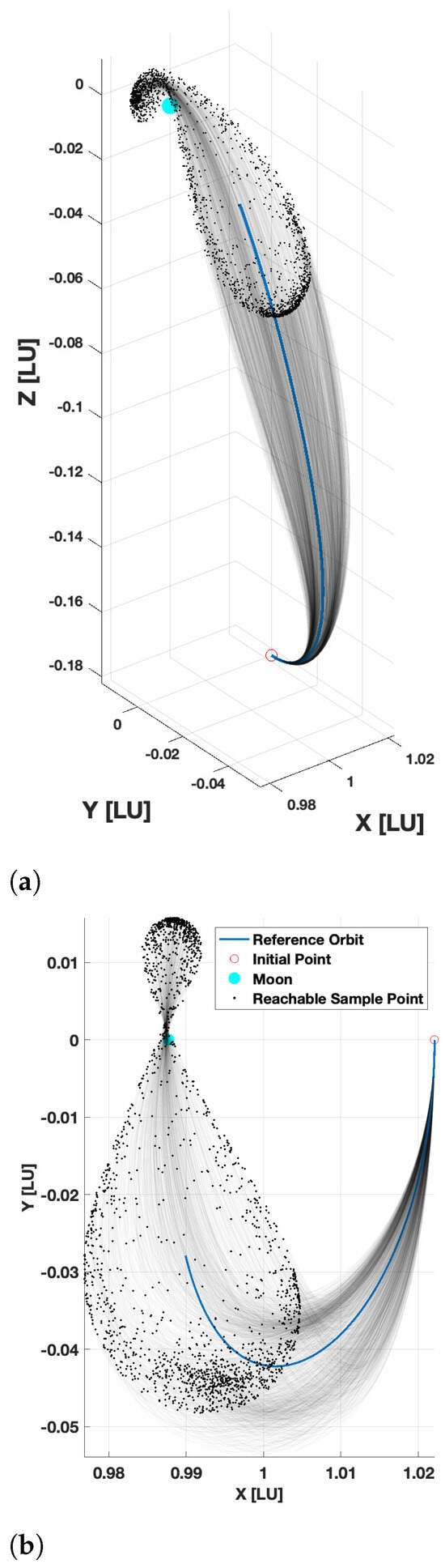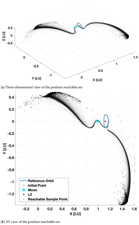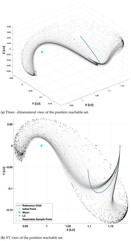 These issues were also identified in [60], in which FFOE was used in an iterative manner. In this approach, each sample trajectory was linearized, and the reachable set was recomputed. However, the method exhibited diminishing returns and numerical stability issues. For the Earth-to-Mars problem [64], the results indicate that for the two-body problems, the number of samples does not have to be large. The presented numerical results for the CR3BP model indicate that accurate and rapid approximation of reachable sets is possible with a sufficiently large sample of points, in particular, over relatively short time horizons, which are practical for reachable set approximation of low-thrust spacecraft.