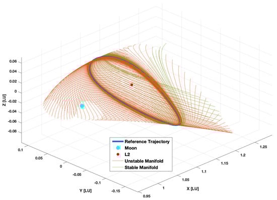 Reachable set overlaid with invariant manifolds for the 350 h L2 reference orbit.
