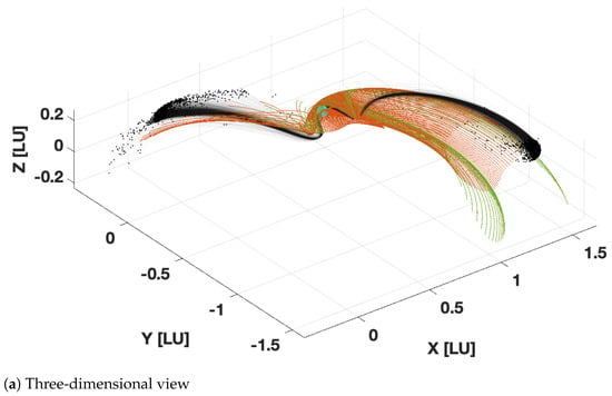 - Bando, M.; Scheeres, D.J. Nonlinear Attractive and Reachable Sets Under Optimal Control in Three-Body Problem. J. Guid. Control. Dyn. 2018, 41, 1766–1775. [Google Scholar] [CrossRef]