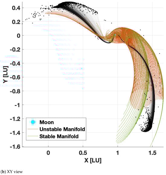 For chemical propulsion systems, an on-orbit range equation was derived for with J2 perturbations [42]. These results were used in [34] to develop closed-form impulsive control schemes by computing a minimum and then solving a geometric path-planning problem. The reachable domain for spacecraft with ellipsoidal distributions was also studied in [43]. For electric propulsion systems, Ref. [44] derived continuous indirect equations incorporating ellipsoidal uncertainty. Several works have formulated OCPs and directly solved the HJB equation to generate reachable sets in the CR3BP over short time horizons [45,46]. Specifically, Ref. [46] took a Poincaré section approach and detailed analysis with invariant manifolds, and [45] utilized a power-series approximation of the HJB to determine periodic orbit transfer trajectories. More recently, a cross-disciplined reachability-based trajectory design (RTD), developed by Kousik, has been used to perform safe path planning for quadcopters, wheeled vehicles, and robotic manipulators [47,48]. RTD computes the forward reachable set of a vehicle offline using zonotope reachability [49]. The forward reachable set is used in real time to perform obstacle avoidance maneuvering by comparing the forward reachable set with an environment map that dictates the safe set. RTD uses this method to perform path planning in real time before feeding the safe trajectory to a low-level tracking controller.