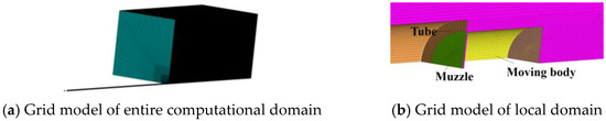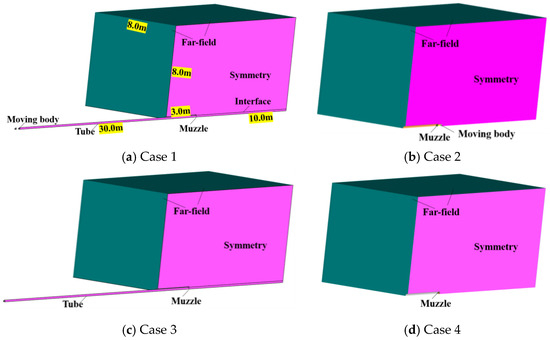 A widely accepted technique is to consider only a quarter of the physical model, rather than the entire model, to reduce computational time and cost. The entire computational domain was divided into structural grids, as shown in Figure 2. Case 1 featured 11 million grids, while each of the other three models had 9 million grids. Mesh refinement is applied near the muzzle and projectile, while it is relatively rough at the boundary of the computational domain. The minimum size of the mesh near the muzzle is 0.2 mm and the mesh growth rate is 1.05. When simulating complex flow fields, it is often difficult to generate a single high-quality structural mesh. In this case, the mesh can be partitioned and concatenated for processing. We thus divided the computational domain into domains with static and dynamic grids and used their interface for numerical exchange.
