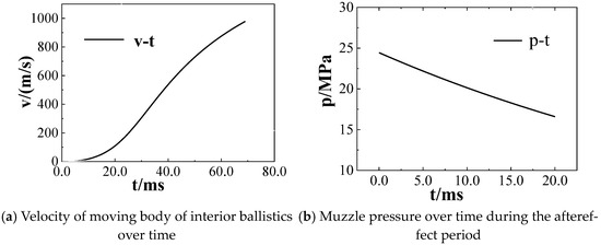 Then, we compiled these models using C language and the language rules that UDF needs to follow, forming the UDF program. We use the UDF program to control the motion of the projectile inside the tube, as well as the initial conditions of the muzzle during the aftereffect period. The parameters corresponding to a conventional launch were obtained through an interior ballistics model as the initial boundary conditions for the numerical calculation of the muzzle jet, as shown in Table 2. The changes in pressure and velocity at the bottom of the tube are shown in Figure 4a,b. And we inferred that the variations in pressure in the muzzle over time were p = 24.4 ×e−24.668t MPa [22,23,24]. This enables us to achieve numerical simulation of the development and evolution of shock waves throughout the entire process of projectile motion.