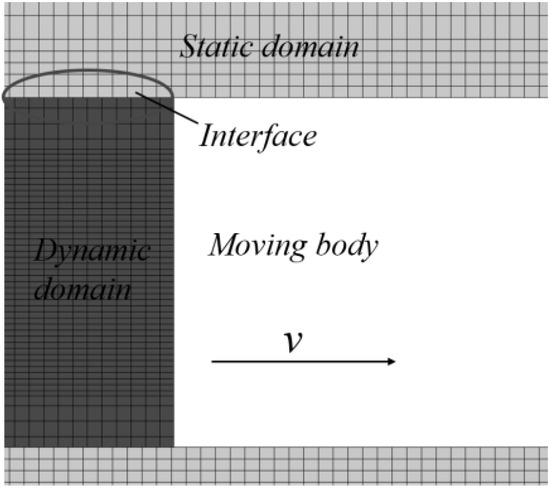 Dynamic meshing technology has been widely used to handle changes in the mesh caused by the motion of a rigid body during calculations, as shown in Figure 5. Commonly used dynamic grid algorithms include layering, smoothing, and local remeshing. Given that we assume here that the body moves only in one direction, the layering method can be used to simulate the motion of the rigid body. The dynamic layering method is a very effective method in dealing with the deformation of stretched mesh, which can handle changes in grid topology, add or remove nodes in the grid, and is very suitable for situations with large motion amplitude. It determines whether to split or merge the grid based on the height of the grid connected to the detection motion boundary and the combined effect of the set splitting factor (Cs), collapse factor (Cl), and grid height reference value (hi). The dynamic layering method includes a height-based dynamic layering method and ratio-based dynamic layering method, both of which have the same principles for grid splitting and merging but have differences in the height of the generated grid. The application of the dynamic layering method is limited to three-dimensional hexahedral meshes and two-dimensional quadrilateral meshes, and it requires high quality of meshes.
