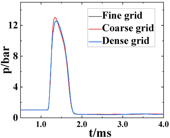 To verify the independence of the grid, we designed three sets of girds, namely 6.0 million, 11 million, and 14 million. They were, respectively, called Coarse grid, Fine grid, and Dense grid. Regarding the variation in a monitoring point (2000, 1000, and 0) mm in Case 4, Figure 6 demonstrates the results of numerical simulations of the different grid models considered. In this article, the region where the moving body moves is set as the moving region, while the other regions are the stationary region, meaning that the mesh is not moving. In this article, the region where the moving body moves is set as the moving region, while the other regions are the stationary region, meaning that the mesh is not moving. The dynamic region in the text is relatively small, and most of it is still a static region. For this reason, using the pressure change at a monitoring point as a grid independence verification can also demonstrate that the calculation results in this article are grid-independent. From the figure, it can be seen that the results of fine and dense grids were very close, with an error of less than 1%. But there were significant differences in the results obtained by the Coarse gird model. It can be concluded that, when using the Fine grid model, the simulation results were independent of the size of the gird.
