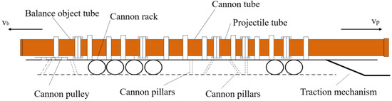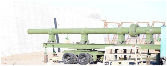 The launch device used here was a test platform for weapons launch with a large caliber and a long barrel, as shown in Figure 7. The device had a diameter of 300 mm, a thickness of the wall of 50 mm, and a total distance of 30 m traveled by the moving body. A schematic diagram of the model is shown in Figure 8. The height between the ground and the muzzle is 2.2 m. Vp means the velocity of the moving body and Vb means the velocity of the balance body. The balance body is a part of the experimental apparatus and an important component for achieving the function and performance of the test, but it is not related to the model in this article. The front half of the tube is the running section of the projectile, called the projectile tube. In the middle of the tube is the chamber, and behind the chamber is the section of the balance body called the balance object tube.