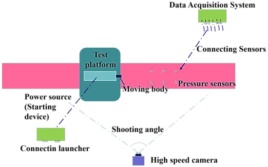 The experimental plan considered here is shown in Figure 9. The test bench was the main launch device that pushed the moving body out of the muzzle at a speed of 932.0 m/s. The moving body flew forward after exiting the muzzle. Dynamic pressure sensors were installed at key points on both sides of its flight trajectory to monitor changes in transient pressure in the flow field. A piezoelectric dynamic pressure sensor was used to obtain the transient pressure at characteristic points in the overpressure field. All pressure signals were collected by using a DEWE2-A13 transient data recorder, produced by DEWETRON Industrial Equipment Company in Graz, Austria, with a sampling frequency of 500 kHz. We chose KISTLER-6215 and KISTLER-211B4 (Winterthur, Switzerland) pressure sensors for experimental pressure testing. Among them, the maximum range of the KISTLER-6215 sensor is 6000 bar, used to measure pressure changes in the tube and at the muzzle, while KISTLER-211B4 sensor is 500 psi, used to measure pressure changes in the flow field. And a Photon high-speed camera was used to capture images of the formation and development of the overpressure field. During the experiment, the ignition system ignited the gunpowder inside the chamber to produce high-temperature and high-pressure gas, which drove forward the moving body at a high speed. The high-speed camera was also used to capture the developmental posture of the muzzle jet and the movement-related posture of the moving body as well as to calculate its speed. We simultaneously triggered the pressure sensors to monitor the pressure at the characteristic points.